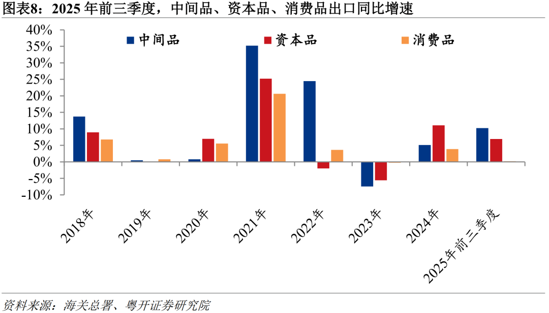 中间品和资本品已成为拉动整体出口增长的主要动力,消费品出口承压。2025年前三季度,中间品出口同比增长10.2%,显著高于2024年全年的5.1%,拉动整体出口4.7个百分点;资本品出口同比增长6.9%,虽低于上年的11.1%,仍拉动整体出口1.4个百分点。相较之下,消费品出口同比仅增长0.2%,拉动整体出口约0.1个百分点,主要受跨境电商商品出口高增支撑,剔除跨境电商商品后,消费品出口同比下降2.4%,拖累整体出口0.8个百分点。