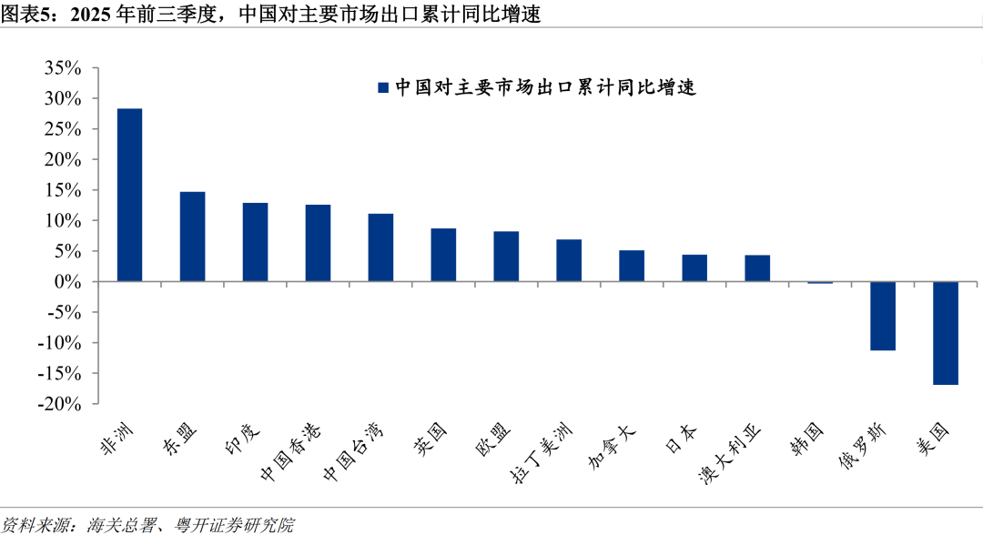 2025年前三季度,在主要出口市场中,中国仅对美国、俄罗斯、韩国的出口同比录得负增长。其中,对美出口受贸易摩擦冲击,同比下降16.9%,拖累整体出口2.4个百分点;对俄出口同比下降11.3%,主要受俄国内经济疲软及去年同期高基数影响;对韩出口同比下降0.3%,与韩国自身经济动力不足有关。与此同时,对非洲、东盟、印度、英国、欧盟、拉美和加拿大等主要市场出口同比均实现显著增长,增速分别为28.3%、14.7%、12.9%、8.7%、8.2%、6.9%和5.1%,合计拉动总体出口增长约6.3个百分点。