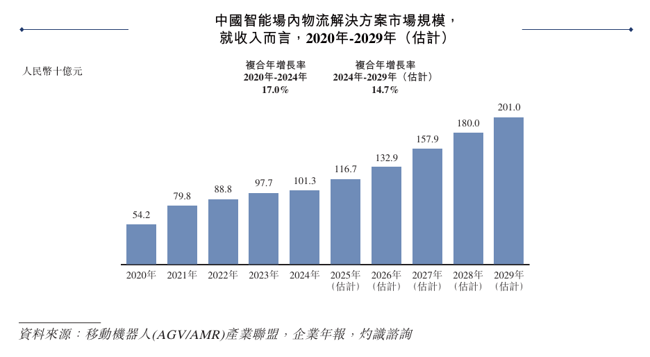 根据灼识咨询数据,全球智能场内物流解决方案市场规模从2020年的3,008亿元增长至2024年的4,711亿元,复合年增长率达11.9%。目前,其全球渗透率约为20%,拥有巨大的增长潜力。在多种因素的综合驱动下,全球智能场内物流解决方案市场未来预计仍将保持良好的增长势头,并于2029年突破8,000亿元。