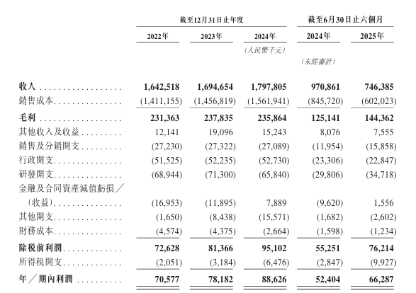2022年至2024年净利润分别为7057.7万元、7818.2万元、8862.2万元,对应毛利率为14.1%、14%、13.1%;2024年与2025年截至6月30日六个月净利润分别5240.4万元、6628.7万元,对应毛利率为12.9%、19.3%。