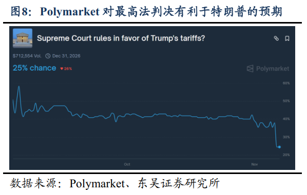 今年5月,美国国际贸易法院裁定特朗普依据国际紧急经济权利法(IEEPA)征收对等关税不符合法案本身内容,特朗普随后一路上诉至最高法院。11月5日,美国最高法院将就该案进行了口头辩论,随后法院将举行闭门会议对案件进行初步投票和讨论,并撰写多数派意见书。由于总统绕过国会授权,依据IEEPA无限制加征关税这一行为违反了三权分立这一美国政治制度设计的核心价值观,因此虽然当前最高法的9位大法官中有6位由共和党总统提名、其中3位更是由特朗普本人提名,但当前市场仍预期最高法院大概率将裁定IEEPA关税违法。而在最高法院口头辩论后,博彩网站Kalshi与Polymarket分别预测最高法院对IEEPA的裁决有利于特朗普的概率仅有23%、25%。