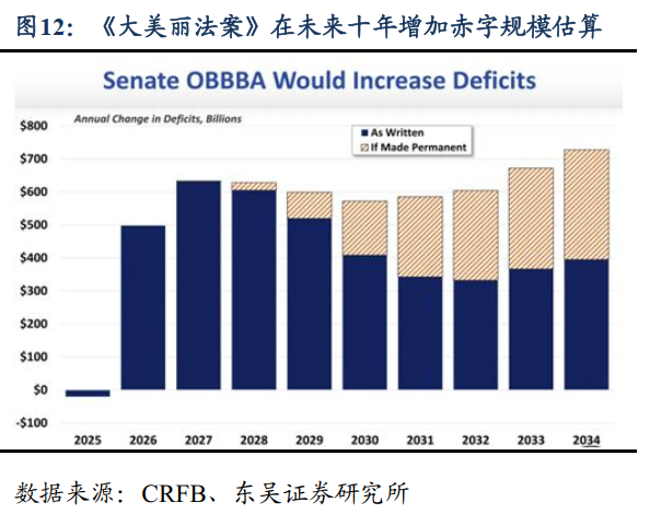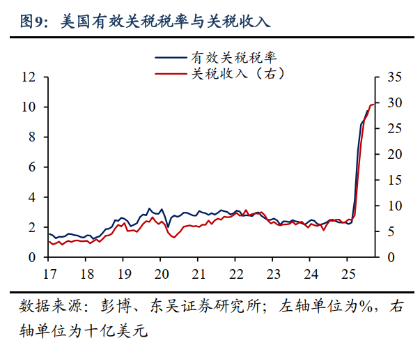 ③创造收入:关税带来的收入能一定程度缓解其宽财政导向面临的压力。根据美国财政部的最新数据,今年1-9月美国关税总收入达到约1740亿美元,较去年同期的580亿美元翻了近三倍。若明年特朗普再度升级关税冲突,则关税收入数字或进一步增加。由于特朗普面对中期选举仍需要交出一份亮眼的经济表现“答卷”,而今年通过的《大美丽法案》存在“增赤在前,减赤在后”的特点(详见报告《大美丽法案:内容、影响与策略启示》),因此关税收入的增加能一定程度上减少明年美国联邦政府的赤字压力,从而为“宽财政”提振经济表现提供更多空间。