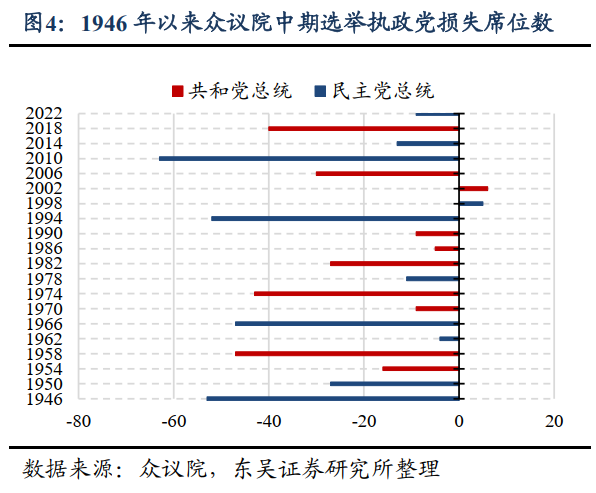 然而,面对中期选举这一“期中考试”,“考生”们给出的“答卷”似乎都不甚理想:失利已是历届总统在中期选举中的常态,因此中期选举也被称作执政党的“中选魔咒”。回顾二战结束后的20次中期选举(1946-2022),总统所在的执政党在众议院、参议院平均要失去25.7席、3.3席。这20次中期选举中,执政党未丢掉众议院、参议院多数党优势的次数分别仅有5次、8次。对于在大选中实现横扫(同时拿下白宫、众议院、参议院)的11位美国总统而言,在次年的中期选举中丢掉众议院、参议院多数党优势的分别有7、4位,同时丢掉众议院、参议院多数党优势有4位,而同时保住众议院、参议院多数党优势仅有4位,即延续横扫优势的概率只有36.36%。