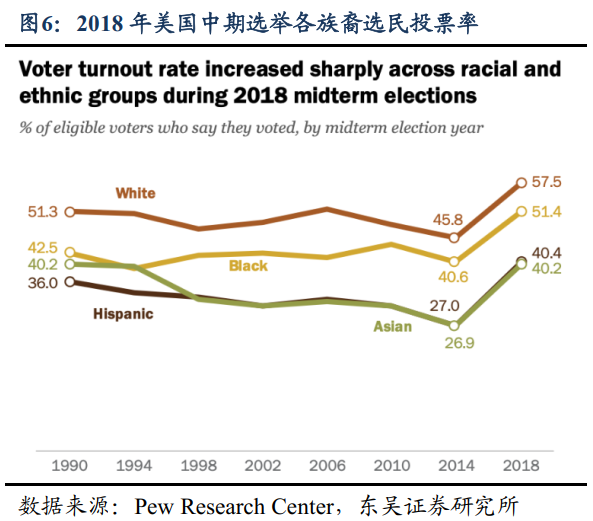 对特朗普而言,要想在2026年中期选举中守住2024年总统大选的横扫优势,其在2018年中期选举时失利的经验教训无疑是最重要的参考坐标。尽管特朗普在2016年总统大选中横扫两院,在2018年中期选举前也给出了一份亮眼的经济“答卷”:GDP同比增速于18Q2增至3.3%,为15Q2以来最高;失业率于2018年9月降至3.77%,创49年新低。但其支持率不增反降(图5),一度跌破40%。而2018年中期选举共有超过1.22亿人参加投票,为自1978年以来最高,也是自1982年以来首次投票率突破50%,所有主要族裔投票率都出现了历史性跃升(图6)。但选民空前高涨的投票热情都是为了表达对特朗普的不满。2018年中期选举后,虽然共和党在参议院凭借“深红优势”(改选的1/3席位多在共和党深红州)扩2席至53席,但在众议院却经历了一场“蓝色浪潮”,共丢40席至199席,为1974年以来共和党在众议院的最大失利。