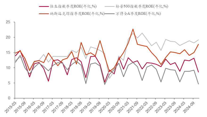 若把中美股市上涨进行归因分析,发现从2020年到2024年,沪深300指数的全收益率为1.2%,其中分红贡献了2.3%,估值贡献了0.4%,企业盈利贡献了-1.5%;而美国标普500指数的全收益率为14.8%,其中企业盈利贡献了9.3%,估值贡献了3.4%,分红贡献了1.8%。纵观全球股市,盈利对股指的贡献都是大比例的,且盈利增长也会带动估值水平提升。